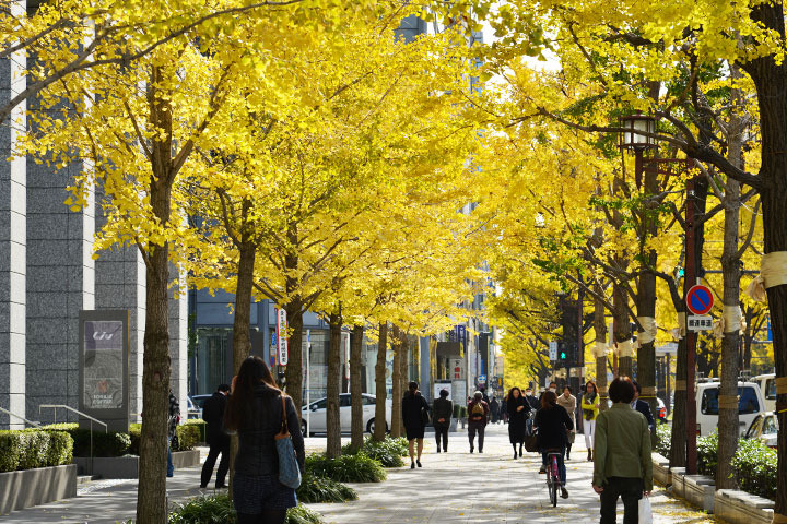 오사카 중심 도로 전체가 황금빛 은행잎으로 뒤덮이는 곳.