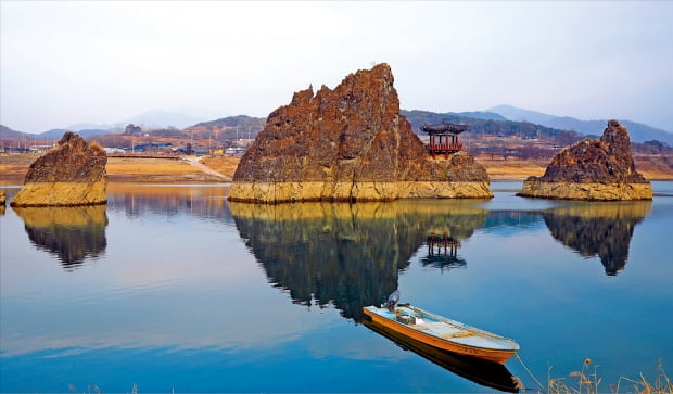 충북 단양의 도담삼봉은 단풍이 절벽을 감싸며 절경을 이룹니다.