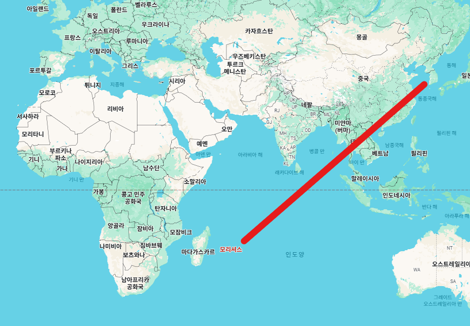 한국에서 모리셔스로 가는 가장 일반적인 루트는 인천 → 두바이 경유 → 모리셔스 SSR 국제공항(MRU) 입니다.