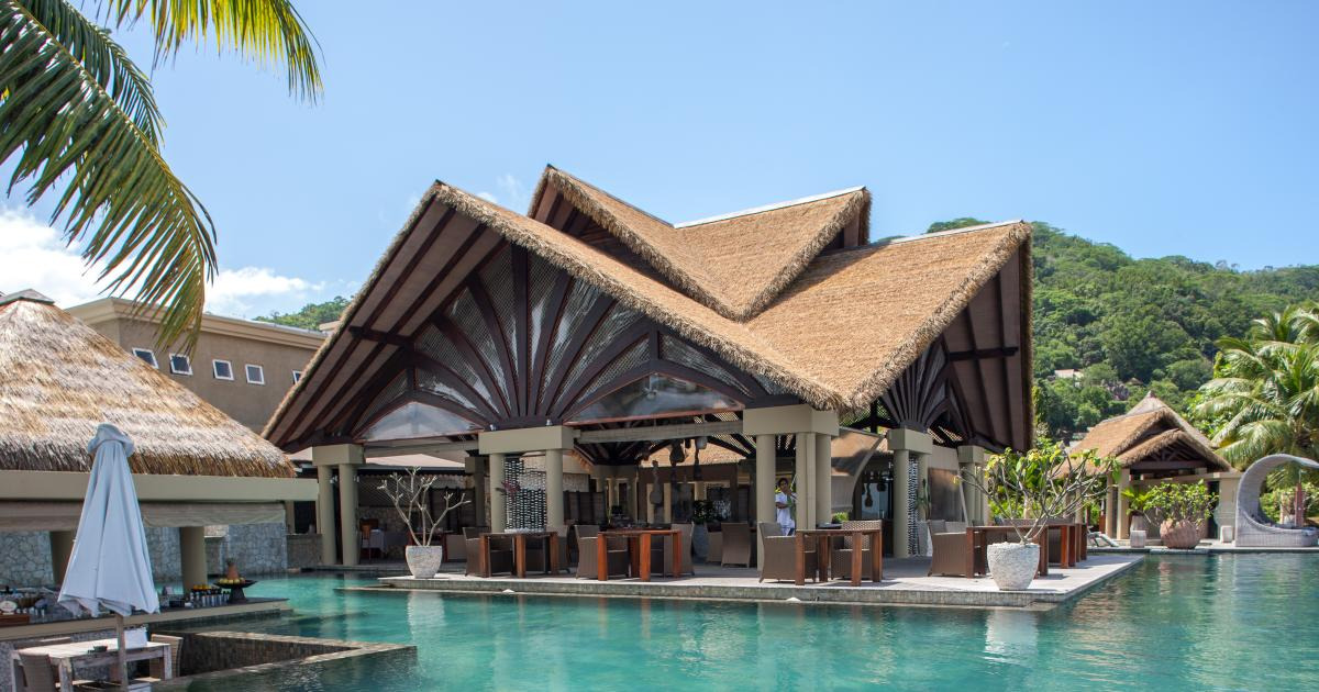 프랄린섬의 최고급 리조트로, 객실 발코니에서 바로 안셀라지오 해변이 보인다.
