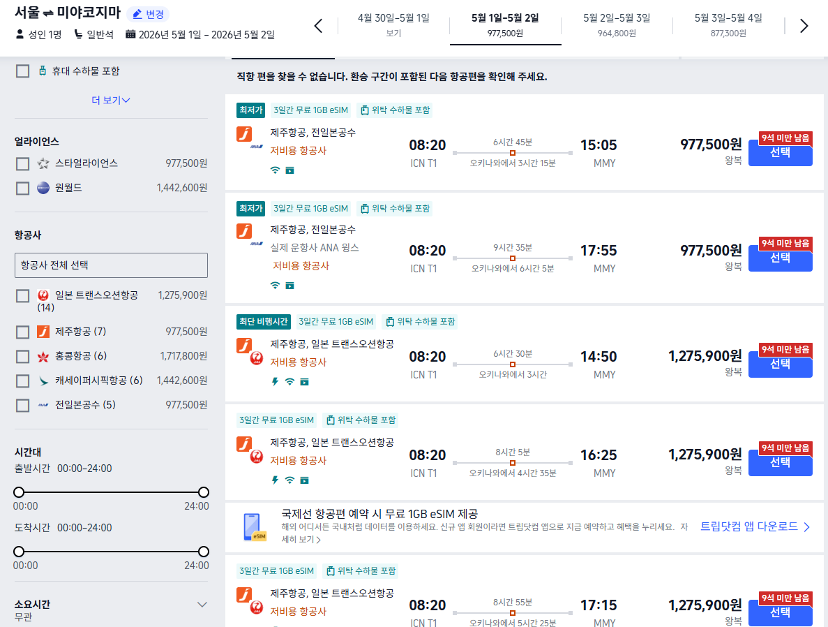 미야코지마는 섬 노선이라 항공권 가격 변동이 큰 편입니다.
