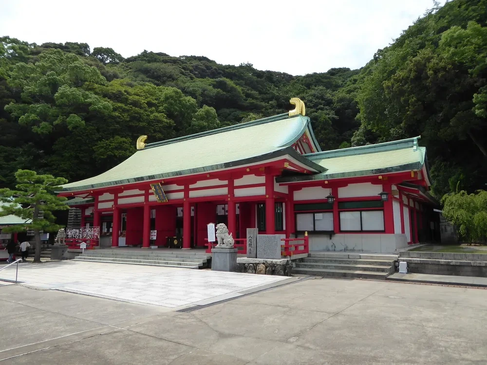 아카마 신궁(Akama Shrine) 은 붉은 기둥과 흰 벽이 인상적인 전통 신사로,