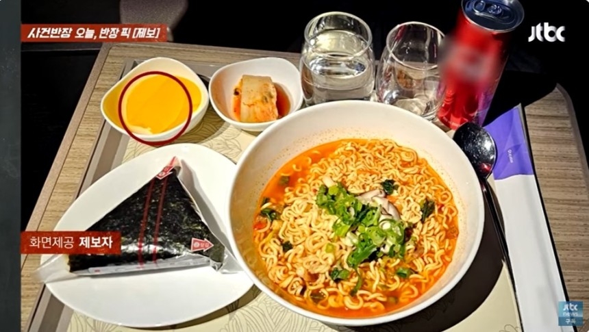 항공사 기내식 라면 사진 사전 예약시..(출처:JTBC) - 특수 식단 옵션: 채식, 비건, 무슬림식(할랄), 코셔식(유대교) 등 다양한 식단을 준비해 두고 있어, 출발 전에 미리 신청하면 맞춤형 기내식을 즐길 수 있다.